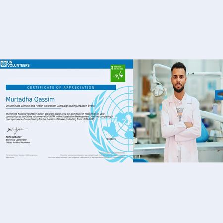 كلية طب الأسنان - جامعة بابل - حصول طالب على شهادة تقدير من برنامج متطوعي الأمم المتحدة لمشاركته في حملة.المناخ.والصحة